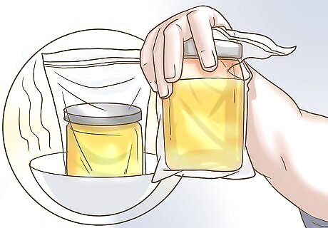Select a container for storing your honey. If you don’t plan to use your honey for a few months it is best stored in the freezer. This prevents the honey from crystallizing and keeps it fresh. Select a container that allows room for the honey to expand, you will need to leave at least one inch of room between the honey and the top of the container. Place the container of honey into a resealable freezer-safe storage bag, this will prevent the honey from absorbing smells from the freezer and will contain any honey leaks. If you have brought your honey in a pre-packaged container you may need to remove some of the honey to allow room for it to expand when it freezes. Pour the honey into the container and wipe any honey residue from the outside of the container using warm water.< Storing honey in ice cube trays allows you to defrost small amounts of honey at a time. Pour the honey into the ice cube tray, use a funnel if necessary. Place the tray in a freezer-safe bag before transferring into the freezer.
