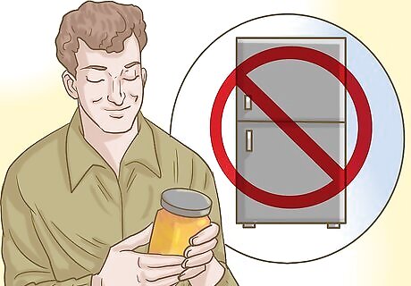 Avoid storing honey in the fridge. Fridges are significantly cooler than the optimum storage environment for honey (70-80 degrees Fahrenheit). The cool temperature will cause honey to crystallize far quicker than if it is stored at room temperature. If your kitchen cupboards are too warm to store your honey, choose a cooler room instead of using the fridge.