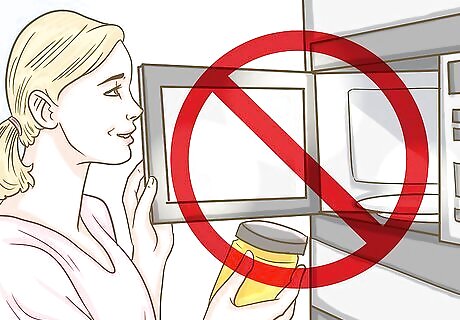 Avoid microwaving honey. Warming honey in a microwave damages the properties of the honey. If you need to soften the honey place it in the oven in an ovenproof dish on the lowest temperature for up to 10 minutes. Alternatively, place the honey into a sealed container and give it a water bath by placing the container into a bowl of hot water until it reaches your desired consistency.
