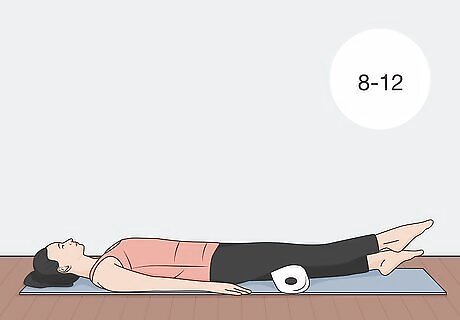 Lie on your back for a short-arc quad stretch. Lay down on the floor with your legs straight out and place a large foam roller under your knees so they bend slightly. Try to straighten your sprained knee out straight while keeping the foam roller under it. Straighten it for 6 seconds and then rest for 10 seconds before doing it again. Repeat this stretch 8-12 times on your sprained knee. If you don’t have a foam roller, roll up a large towel and place it under your knees instead.