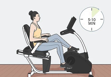 Warm up your muscles before doing the knee exercises. You might warm up by taking a 10-minute walk or riding a stationary bike for 5 minutes. A short warm up will stretch your knee gently so it’s ready to do some more intense stretches. Your warm up only needs to be 5-15 minutes long.