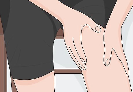 Loosen your muscles with self-massage. Use the heel of your hand to make slow strokes along your thigh, moving away from your body and toward your foot. Repeat on each side of your thigh. Then, use 4 fingers to gently knead the skin over your knee. Finally, place your palms flat on your front thighs and rub down over your knee cap. Slide your hand back up your inner thigh to finish the massage. You can apply a massage oil to your thighs to make it easier for your hands to glide over your skin. Don't use lubrication on your knees so your fingers don't slip while you're kneading your skin. Self-massage can help you start to regain your range of motion in your knee by loosening any tightness around it.