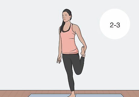 Stand up and stretch your quadriceps to bend your knee fully. Stand up straight on one leg and hold onto a chair or wall to help you balance, if you need to. Bend your sprained knee while grabbing your ankle with your hand and bring your heel as close to your bottom as possible. Hold this stretch for 30-60 seconds before slowly releasing your leg again. Do this on both legs to stretch them out and repeat the stretch 2-3 times for each leg.