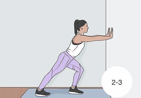 Increase your knee’s strength by doing a standing calf stretch. Stand up facing a wall or a chair and hold onto the wall or chair to help you balance. Bend your knees slightly and step back with one leg, lowering yourself into the stretch. Keep the other leg straight under you and hold the stretch for 30 seconds. Switch legs to stretch the other knee, too. Do this 2-3 times for each leg. Take a big step back so you feel the stretch properly.