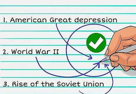 Write down connections between the chronological notes you take. Studying history can often feel like you’re memorizing a bunch of disconnected dates, names, and places. Avoid this by making the connections explicit in the notes that you take. Then, when you’re preparing for a test or essay, you’ll be able to draw on these connections and contextualize historical events. For example, write down causal links between major 20th century events like the American Great Depression, World War II, and the rise of the Soviet Union.