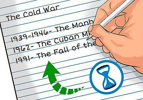 Organize your notes chronologically. It goes without saying that the field of history comprises many events that took place in a certain chronological order. Maintaining that chronology in the notes that you take both in class and while reading will help you organize the information you receive. Always jot down the date of events in your notes and try to keep things sequential. For example, if you’re studying the Cold War, organize major events like the Manhattan Project, the Cuban Missile Crisis, and the fall of the Berlin Wall in the order in which they occurred. Use several resources to ensure the accuracy of your historic research.