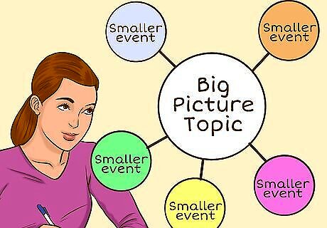 Focus on remembering big-picture events and concepts. When reading and studying history, it’s easy to get bogged down on little details. This makes it nearly impossible to retain the information you’ll need to pass a test or write an essay. Instead, focus on the big-picture topic (e.g., the course topic and sub-topics) and think of smaller events only as they relate to the major topic.This will hone your understanding of the material. For example, if you’re spending 6 weeks studying the American Civil War, don’t try to remember the names of every battle and military movement. Instead, focus on remembering 4-5 major figures on both sides, 4-5 major battles, and the war’s political causes and fallout.