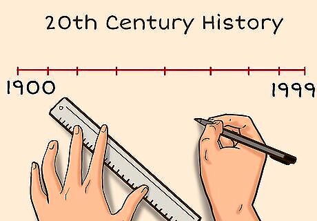 Draw a timeline of the historical period that you’re studying. A timeline is a great visual aid when it comes to understanding the sequence and chronology of historical events. So, if you’re studying 20th century history, label a line from 1900 to 1999, and fill it in with major events like the World Wars, Cold War, and Vietnam War. Also add events like the invention of the internet and the assassination of JFK. If the timeline becomes too long to fit on a sheet of notebook paper, try using a strip of butcher paper instead. If you have access to a digital device, try making your timeline online using a fun template. You can find a good template with a simple online search.