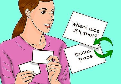 Memorize necessary dates and names using flash cards. While making connections between chronological events is great, sometimes you just need to memorize historical data. Try writing a small prompt on the front of the card and the answer on the back. Then, you can quiz yourself during your daily study time. Or, get together with a couple of friends from your history class and quiz each other in preparation for the test. For example, on the front of the card, write “Where was JFK shot?” and on the back write “Dallas, Texas.” EXPERT TIP Carrie Adkins, PhD Carrie Adkins, PhD PhD in American History, University of Oregon Carrie Adkins is the cofounder of NursingClio, an open access, peer-reviewed, collaborative blog that connects historical scholarship to current issues in gender and medicine. She completed her PhD in American History at the University of Oregon in 2013. While completing her PhD, she earned numerous competitive research grants, teaching fellowships, and writing awards. Carrie Adkins, PhD Carrie Adkins, PhD PhD in American History, University of Oregon How do the important people relate to one another? Carrie Adkins, PhD in History, tells us, "It’s much easier to remember people’s names if you know why those people are important and how they're related to each other — if, basically, they become characters in a story you know."