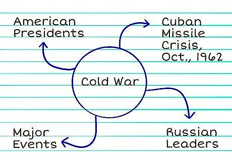 Make a visual map of interconnected historical events. This can be a timeline, a flip book, or what-have-you. If you are a visual learner, retaining written information can be a challenging task; try mapping out historical events on a few sheets of note paper instead of writing them down. If you’re studying the Cold War, write “cold war” in the center and draw several lines out around it that draw in American presidents, Soviet leaders, and major events. Make sure to add a date near each of the events and figures on the map. So, when you write “Cuban Missile Crisis,” add “October, 1962.” Don't include information you do not need.