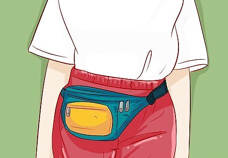 Hang a fanny pack over one shoulder for a fashion-forward bag. Grab a neutral fanny pack that goes well with any outfit, like black or brown. Instead of wearing it around your waist, pull it on over one shoulder so that it hangs on your torso like a crossbody bag. Use a neon fanny pack to make it stand out. Red windbreaker pants, a white shirt, and a black fanny pack pair well together for a simple look.