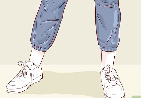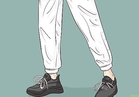 Create a sporty outfit by wearing some running shoes. Windbreaker pants were made to exercise in. Use running shoes to copy the sporty look, or even to go running or jogging. Black running shoes, black and white windbreaker pants, and a navy jacket pair well together for a quick jog through the neighborhood.