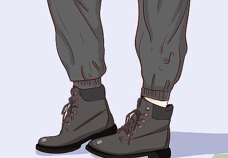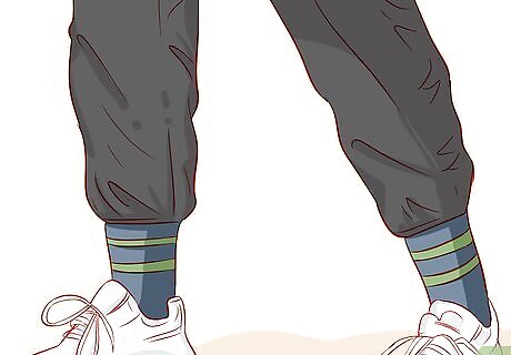 Tuck your pants into crew socks for a bold look. Wear crew socks that hit above your ankles. Pull the bottoms of your pants into your socks and smooth them out flat.Tip: This is a great look if you want to show off your new shoes and make them stand out.