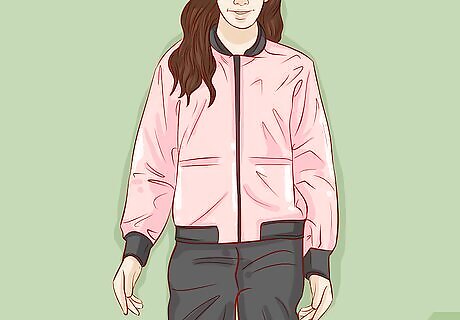 Elevate your outfit with a bedazzled bomber jacket. If you want to stay away from the sporty aspect of windbreaker pants, throw on a bomber jacket with some sparkly accents to make your upper half pop. Choose a silky bomber jacket to elevate it even more. Wear a pink bomber jacket with some black windbreaker pants and white sneakers for a cute outfit.