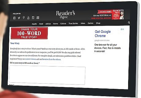 Learn the types of magazines that take stories. Literary magazines, usually either university or indie presses, are mainly the ones who take short stories. There are many other magazines out there, from scientific to pop culture, but most of these magazines aren't looking for short stories. Focus on finding literary magazines. Literary magazines aren't the only magazines that take short stories. The New Yorker, for example, has a short story section. There are many articles on the internet that compile lists of magazines that accept stories. Find one of these lists to get started. Some magazines advertise for submissions to “contests” rather than directly to their magazines, so include the word “contest” in an internet search for magazines to submit to.