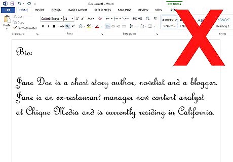 Avoid decorative fonts. Decorative fonts like script or cursive make your writing unprofessional and your words difficult to read. Since the industry standard is plain, clear fonts like Calibri and Times, your submission should reflect understanding of this. If you want to be taken seriously, be serious about your font. Also avoid creative font colors and varying sizes of font.
