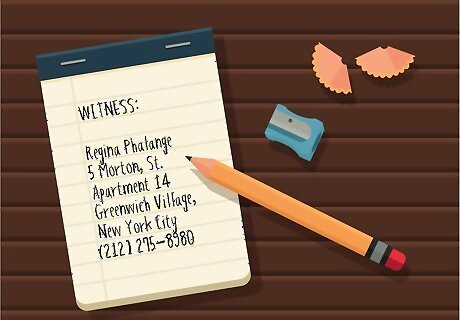 Identify witnesses. If someone saw the accident or the hazard, then you should get their name and contact information. If the police were called, then witnesses could be listed on the police report. You should get a copy. Take down the person’s name, address, and phone number. Also, try to get an email address.