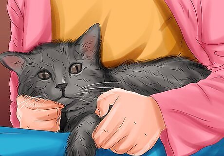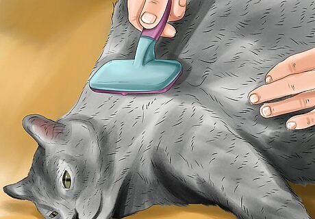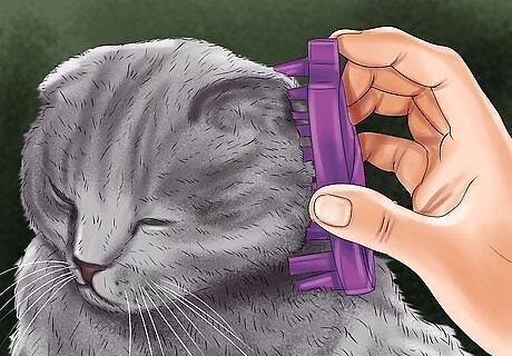 Trim the cat’s nails every other week. To keep the cat’s nails from growing too long, plan to trim them regularly. Hold the cat in your lap, lightly massage the cat’s paw, and gently press the toe pad to extend the nails. Use clippers to trim the white part of the nails, being very careful to avoid cutting the quick, which is the dark area where the blood vessels are located. If you accidentally cut the quick, apply some styptic powder to the cut. You can find this product at pet stores and online. If you’ve never cut a cat’s nails before, take the cat to the vet and ask them to show you how to do it.
