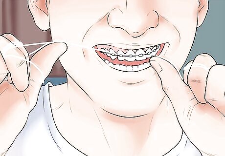 Floss at least once a day. Flossing with braces is a bit more difficult because the wires get in the way of the floss. However, a floss threader can help. You pull about five inches of floss through the loop of the threader, then pull the threader in where you can't get the floss (above the wire). Make it go between your teeth, then take the floss out of the threader to floss your teeth. A water flosser may also help. Certain models have special orthodontic tips included, so keep that in mind when selecting your device. There are also special flosses that are made out of individual strands that have a stiffer end that serve as a threader, connected to a spongy floss segment and a regular floss segment. These make cleaning between the teeth and around braces easier.