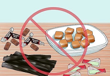 Skip chewy and/or sticky foods. Foods like gummy bears, peanut butter, caramel, and dried fruit can all cause issues for braces. They are likely to get stuck in the braces, and you might break the braces trying to get the food out.