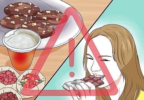 Minimize sugary foods. Foods and drinks such as cake, candy, ice cream, pie, and soda don't do your teeth any favors. The bacteria that form plaque love sugar. Make sure you brush and floss after you eat foods or drink beverages high in sugar. Eating sugary foods is especially a problem when you're wearing braces because plaque can build up in more places than normal, such as around the brackets.