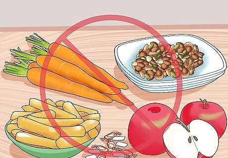 Avoid hard foods for the most part. Hard foods, including hard candies, pretzels, and even foods like raw carrots and apples, can be a problem with braces. They can cause wires or bands to snap. Other hard foods to avoid include chips, taco shells, and even popcorn. Nuts, ice, and beef jerky can also be a problem. Also, don't chew on non-food items like nails, pencils, and pens. Some foods, such as apples, carrots, and other healthy hard foods, can be adapted to be eaten with braces. Simply cut them into small pieces before eating.