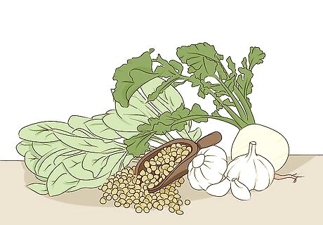 Vary your veggies. Certain veggies are good sources of iodine, though it does depend on the soil they were grown in. Eat veggies like garlic, soybeans, turnip greens, summer squash, spinach, Swiss chard, and sesame seeds.