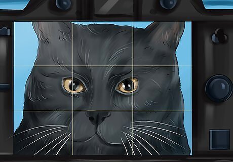 Compose your shot using the rule of thirds. The rule of thirds is a photography principle that makes photos more pleasing to the eye. Divide your image using two evenly spaced vertical and horizontal lines, then position your pet’s eyes or face on one of the areas they intersect. This will make your image more dynamic and fun to look at. Many picture apps and cameras have a rule of thirds grid built into them, though they may be off by default. The rule of thirds is a great starting place, but don’t let it stop you from trying other photos out. Symmetrical or off-balance pictures are often incredibly beautiful.