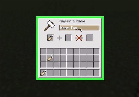 Use an anvil to engrave a name tag. To engrave a name on a name tag, have the name tag in your inventory and right-click on an anvil. Drag the name tag to the first slot on the left in the anvil menu. Click on the box below "Repair and name" and delete "Name tag" in the box. Then type the name you want to name your horse. Drag the engraved name tag in the slot on the right back into your inventory. This costs 1 enchantment point.