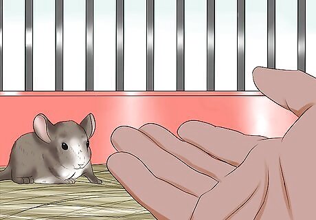 Do not try to hold or touch her right away. Your new chinchilla is overwhelmed right now, getting used to the sights and sounds of her new home. Some chinchillas are naturally friendly, but others are more anxious and may require a few days to weeks to get used to you before you should attempt to hold her. In the meantime, there are a few things you can try to help her get used to your scent and presence. For the first few days, simply spend time in her room, speaking to her in a calm and quiet voice through her cage. While it is true that your chinchilla won't understand your words, she will understand your soothing tone and comforting presence. She will begin to associate you with safety. Open her cage door, and rest your hand just inside the cage. Do not try to grab or touch her or move your hand too quickly, though, or you might startle her. She may hide from your hand, but keep doing this at least once a day. Some chinchillas will come over and smell you and explore your arm right away; others will take weeks to get comfortable enough to move closer. Be patient.