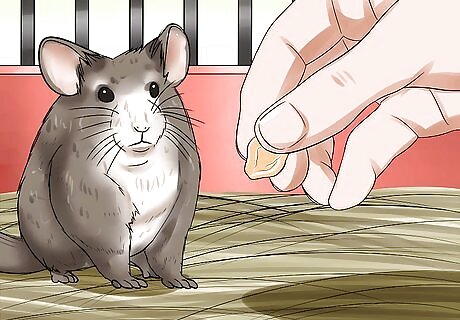 Be patient with very stressed chinchillas. Patience is key. Chinchillas who are very fearful may require weeks of getting used to your presence by smelling your hand and hearing your voice before they will be comfortable with a light touch. If she is vocalizing or acting very panicky, do not approach the cage except to feed, water, and clean the cage. Do these things efficiently but not so quickly that you startle her more. Avoid looking her in the eye, which can be threatening to a rodent. Instead, sit near hear her cage and look toward her cage with closed eyes, and calmly say reassuring things like "Good girl." Try offering treats. While it is not a good idea to give treats to a pet chinchilla on a regular basis, a treat can go a long way as a peace offering, helping your chinchilla associate you with good things instead of fear. Try a few organic oat in the palm of your hand, to entice her to come near to you.
