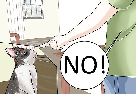 Say no to your rabbit. Rabbits are not able to understand English commands like other species, but you can demonstrate your displeasure with your rabbit’s scratching by using the same audible sound and tone in conjunction with stomping your foot or turning your back. Say no with the same tone and volume each time you use it. Using it in conjunction with stomping or turning your back will help establish that hearing your say “no” is a negative thing on par with other methods you use to train the rabbit.