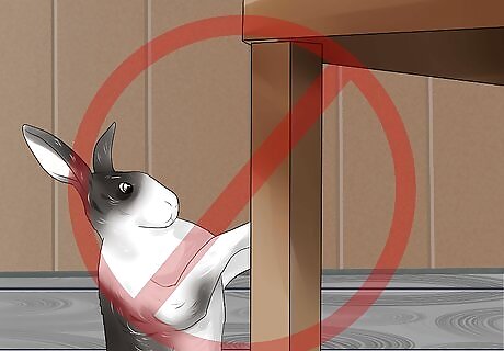 Work within your limits. Rabbits do not possess the intelligence of most dog breeds, so training a rabbit in a similar fashion will not yield similar results. Rabbits are, first and foremost, wild animals that are concerned with survival. Rabbits are not extremely trainable animals, so you should still keep things you don’t want scratched or bitten out of their reach. “Rabbit-proofing” your house by limiting the rabbit’s access to things you don’t want ruined is the only completely effective way to prevent rabbits from scratching or biting through things you don’t want them to.