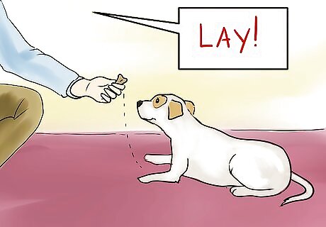 Keep practicing. Eventually, you should be able to tell your dog your command, i.e. "drop!" and he will plop down into the laying position. You should treat him right away for this at first, but as he grows confidence in the command you should hold off a little longer and a little longer before rewarding him (with treats, words, or affection) so that he understands that he must then stay laying