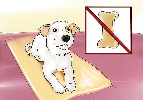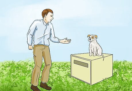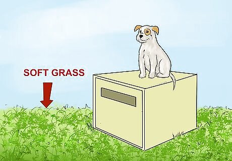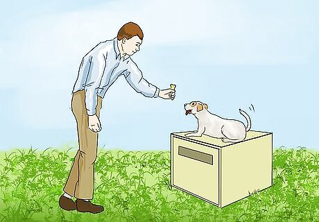 Find a sturdy chair or box on which your dog can comfortably stand, and is not afraid of being on. Practice in a safe location, either on a carpeted floor or outside in the grass to ensure your dog will not be harmed if he decides to hop off. If you do not wish to use a chair or box, or your dog is too afraid, the top of the stairs can be a good alternative. What you need is a ledge that you can pass the treat under, encouraging your dog to lay down as in the General Method.