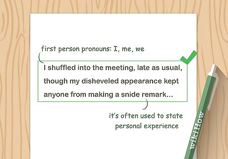 Teach how first person tells a story from the perspective of the narrator. In first person, the narrator is a character in the story. This point of view uses first person pronouns, like I, me, we, and us. First person is often used to state personal experience. First person is often found in novels, autobiographies, and personal essays or reflections.
