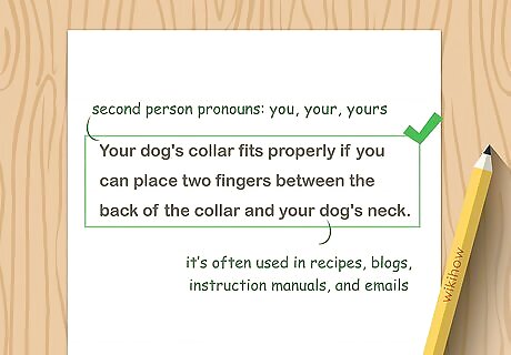 Show how second person is used to talk to the reader in the story. Second person uses pronouns like you, your, and yours. Second person is used to talk to the reader or to instruct the reader. Unlike first and third person, it is not often used in fiction. Second person can be found in texts like recipes, blogs, instruction manuals, and emails.