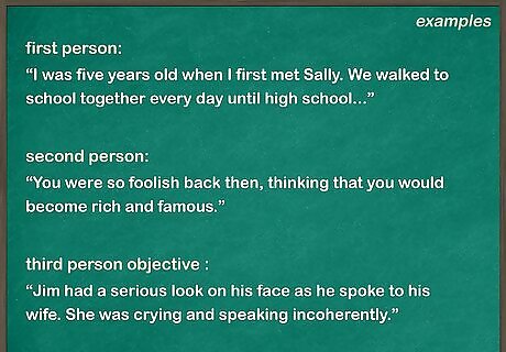 Give students examples of each type of point of view. Take excerpts from books to show how each type of point of view functions within a story or text. Keep examples short. Look for passages that are around 3-5 sentences long. Once you have shown your students a few examples, give them a few more and ask them to tell you what the point of view is. Is it first, second, or third person? The examples should be appropriate for the age group you are teaching. Point of view is most often taught between the ages of 7 and 10, so make sure that the sentences are simple and easy to understand for young readers. You may also teach point of view to students when they are ages 11 to 14, so the sentences could be slightly more complex at this point.