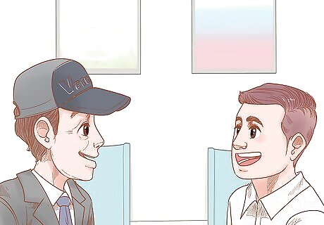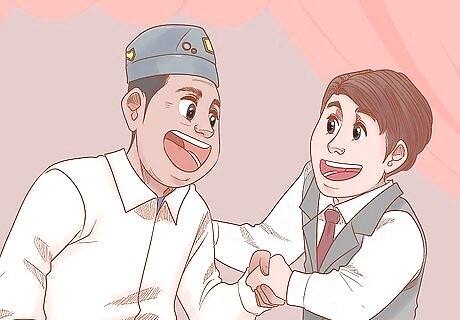 Approach a veteran at a veterans organization or military event. Veterans are allowed to wear their Service Dress Uniform, or formal uniform, on special occasions and holidays. Approach a veteran wearing their uniform on national holidays, parades, formal functions, and other military occasions. If you are volunteering at a veteran organization, you can also approach members of the organization during special events to thank them for their service. The Service Dress Uniform typically includes a military blazer, hat, and dress shoes. Make sure that the veteran isn't occupied with something when you approach them.