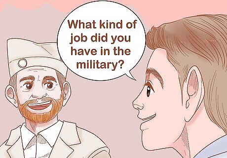 Never ask questions about combat. You should never ask about combat experiences unless the veteran starts the conversation. Typically these experiences are traumatic, and it’s inappropriate for you to bring it up. Instead, concentrate on the veteran’s job and the positive things that they learned and did during their service.