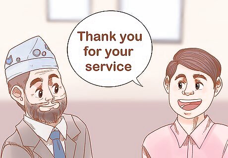 Say “Thank you for your service” to the veteran. Some veterans appreciate the thanks while others feel awkward or indifferent about the admiration. It isn’t mandatory to thank a veteran for their service, and some veterans actually prefer that you don’t do it at all. Alternatives include “Thank you for your sacrifice” and “Thank you for your dedication.” If you want to avoid an awkward encounter, you can thank veterans in other ways, like by donating to a veteran organization.