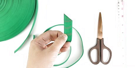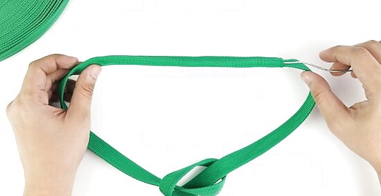 Cut 1 in (2.5 cm) from the end of the webbing so it’s at a 45-degree angle. Use tubular webbing that’s at least 1 inch (2.5 cm) thick and 36 inches (91 cm) long for your sling. Lay one end of the webbing flat on a cutting board or sturdy work surface. Start cutting from the corner of the webbing with a utility knife so it makes a 45-degree angle. Throw out the cut piece of webbing. You can buy tubular webbing from outdoor supply stores or online. It may take 2–3 slices to completely cut through the webbing. Try using a pair of scissors to cut the webbing if you don’t have a utility knife.