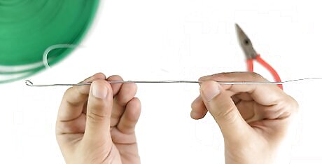 Straighten a piece of wire hanger with a pair of pliers. Cut the hook off the top of a metal hanger with a pair of wire cutters and throw it away. Grip a corner of the remaining section of the hanger with pliers and slowly bend it so it’s straight. Continue straightening out the other bends in the wire until you have a section that’s about 18 inches (46 cm) long. You can also use a skewer or knitting needle instead of a wire hanger.Tip: Bend one end of the straightened wire into a ⁄4 in (0.64 cm) loop to help prevent the webbing from slipping off of it.