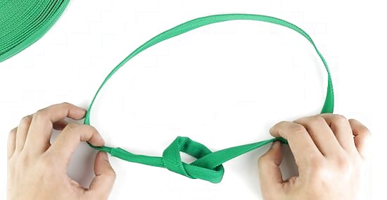 Tie a loose overhand knot 18 in (46 cm) from one end of the webbing. Lay the tubular webbing flat on your work surface so it doesn’t have any twists or tangles. Grab a spot on the webbing that’s 18 inches (46 cm) down from the cut end and form a 2–3 in (5.1–7.6 cm) loop. Feed the cut end of the webbing through the loop and pull it through to form your knot. You need to pre-tie a knot in the webbing since you won’t be able to make one once you form the webbing into a loop.Warning: Don’t pull the overhand knot so tight that you won’t be able to undo or loosen it later on. You will eventually need to reposition it to form the beer knot.