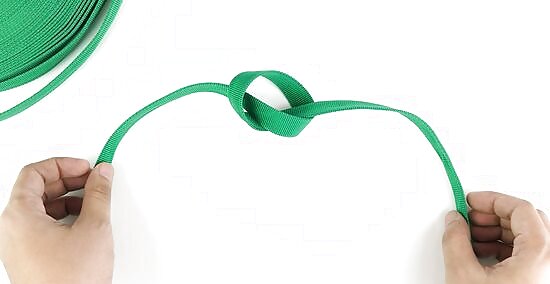 Tighten the knot to secure the ends. Grab the webbing on both sides of the knot and pull them away from each other. Keep the webbing as flat as possible so you can pull the knot as tight as possible. Make sure the ends of the webbing extend out at least 3 inches (7.6 cm) from each side of the knot, or else they could slip out and come loose. Yank on each side of the knot to ensure the knot doesn’t come undone. If you try to tighten the knot and it comes undone, then you will need to reinsert the cut end.