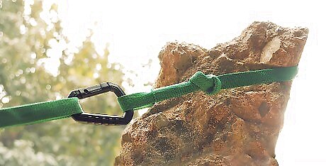 Loop the sling around rocks while climbing to use as a safety harness. Make sure there aren’t any sharp edges or points on the rock since they could slice the tubing. Position the sling so it loops around the widest and sturdiest portion of the rock so it can support your weight. Attach carabiners to the sling so you can clip onto it and use it for support. Slings made with 1 in (2.5 cm) tubular webbing can usually support about 400 pounds (180 kg). Keep the knot away from the rock to help ensure that it doesn’t come undone.Tip: You can easily undo beer knots while you’re climbing if you need the length of tubular webbing. However, it is difficult to retie the knot while you’re in the field.