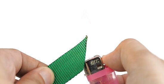 Seal the corner of the cut end with a lighter to form a pocket. Hold a lit match or lighter about 1 inch (2.5 cm) underneath the cut end of the webbing. Run the pointed corner of the webbing through the flame for 1–2 seconds before removing it. Press ⁄2 inch (1.3 cm) of the cut edges together so they stick to each other before running them through the flame again. Keep singeing the cut edges on the pointed corner until they stick together and create a ⁄2 in × ⁄2 in (1.3 cm × 1.3 cm) pocket. Don’t seal the entire cut edge, or else it will be more difficult to insert into the hollow opening on the other end of the webbing.