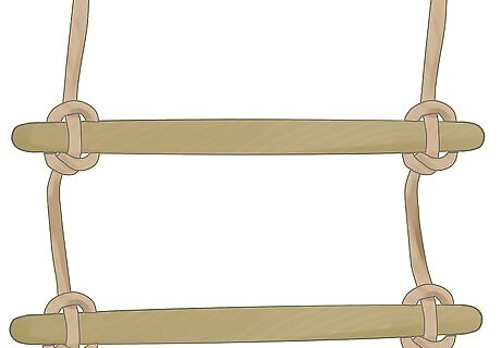 Use two ropes to make a ladder, tying a hitch to the end of each rung. If you have two identical ropes hanging down, you can make marlinespike hitches at identical heights to create a rope ladder. The actual knots are the exact same, but you should test each set with a vigorous pull to ensure they are all weight bearing. Note, however, that You must start from the bottom up. The final hitch you tie needs to be your top rung for the greatest strength and durability. Test the ladder every time you use it. Over time, all knots may lose some of their strength and start to become loose. Secure the rungs, especially the top ones, with clamps that prevent the rungs from falling off for longevity and added safety. Ensure that your rungs are as horizontal as possible, with evenly spaced rungs.