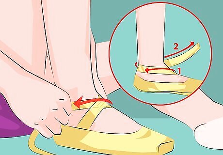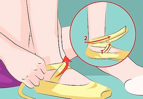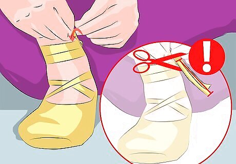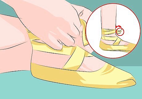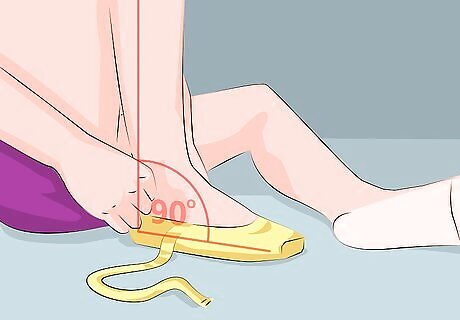 Position your foot. When tying pointe shoes, sit on the ground and have your foot flat on the floor. Your leg should be bent at the knee, creating a 90° angle between your ankle and your leg. This ensures that when you tie your pointe shoes, your ankle is flexed, giving the ribbons slack when you actually stand up on the pointes. That way, you don’t initially tie your pointe shoes too tight, hurt yourself with the taut ribbons, and cut off circulation when you come down from pointe with you feet flat on the floor.