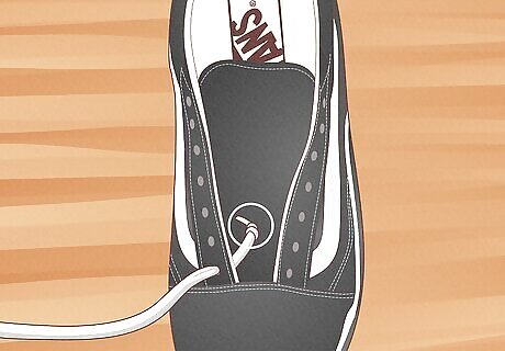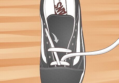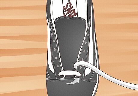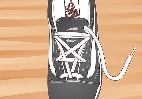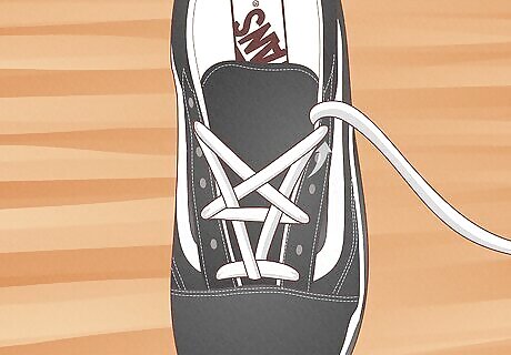 Pull the lace under the tongue to the top of the shoe, adjust as needed, and tie. Maneuver the end of the shoelace under the tongue and bring it to the top of the shoe, where the opposite end of the lace should be. Then, adjust your laces until you like the look of the star and the tightness of the shoe. Finally, secure the laces by tying the two ends into a knot behind the top of the tongue—then repeat all of these steps with your other shoe! If you’re lacing Old Skool Vans, you might not have enough length on your shoelaces to tie them. In this case, just leave the ends hanging out of the top eyelets.